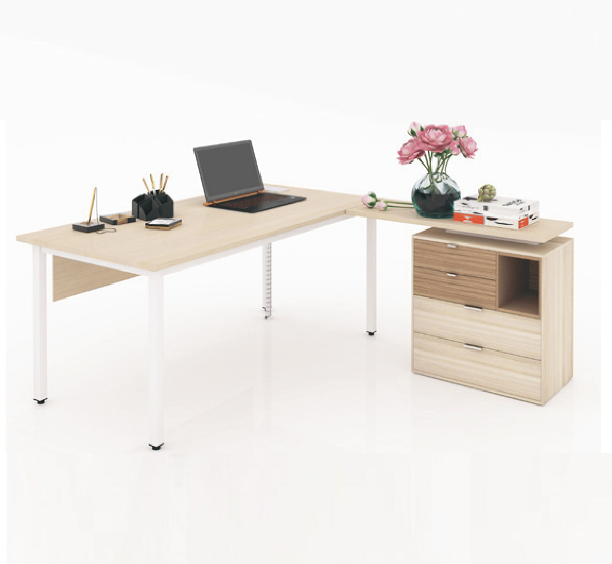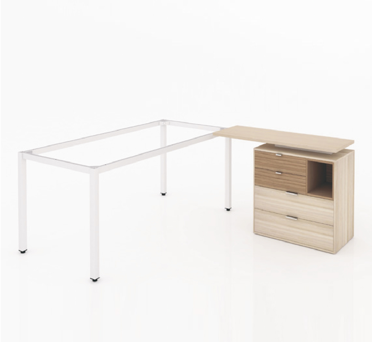Mặt bàn chữ nhật nối liền xuống dưới là thanh xương sắt nâng đỡ mặt bàn được bắt với chân sắt vuông.