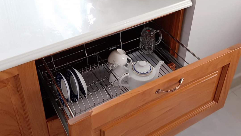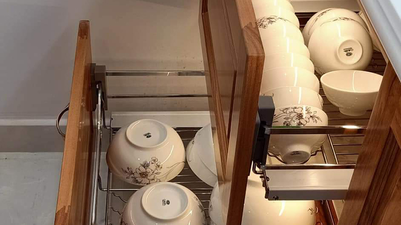 Giá bát đĩa sử dụng ray âm giảm chấn toàn phần tạo sự chuyển động mượt mà êm ái khi sử dụng.