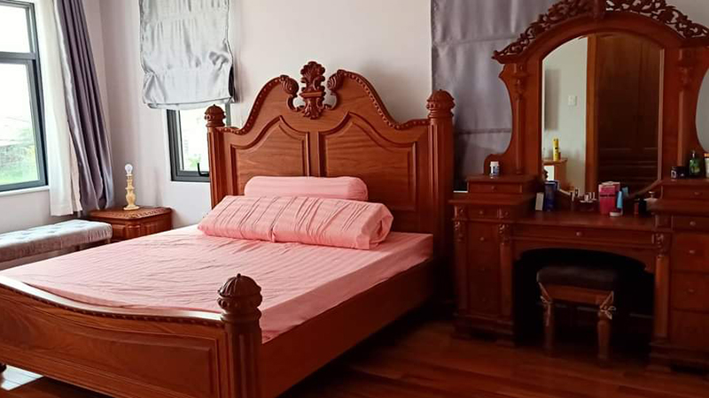 Giường ngủ và bàn trang điểm chế tác hoàn toàn từ gỗ gõ đỏ tự nhiên, cao cấp, chạm trổ tinh xảo theo phong cách hoàng gia, tạo nên không gian phòng ngủ đẳng cấp.