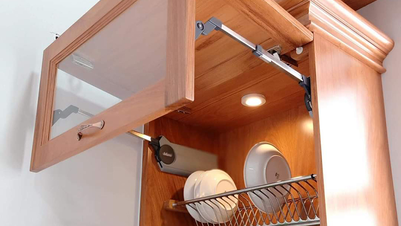 Cánh khoang giá bát tủ treo sử dụng hệ tay nâng Blum thương hiệu châu âu đến từ nước Áo, tạo chuyển động mượt mà, hỗ trợ đóng mở cánh trong quá trình sử dụng.