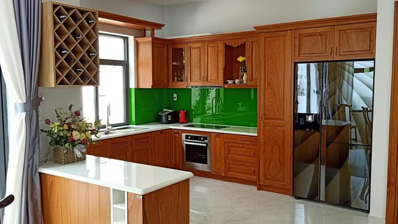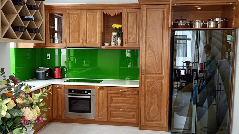 Xen kẻ vơi màu gỗ là màu xanh lá cây thiên nhiên của kính ốp bếp, là màu hợp phong thủy với mệnh mộc của gia chủ.