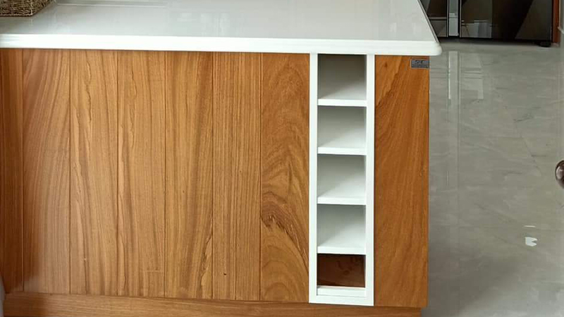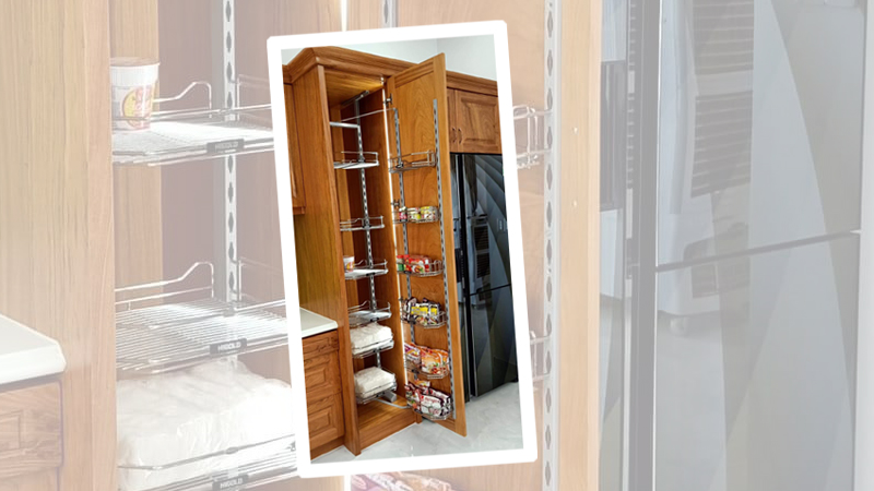 Phụ kiện tủ bếp từ gỗ đỏ tự nhiên được lắp đặt bằng phụ kiên inox tiện dụng