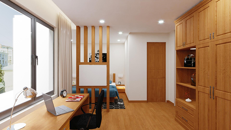 Bàn làm việc liền kề với vách ngăn tủ tiện dụng
