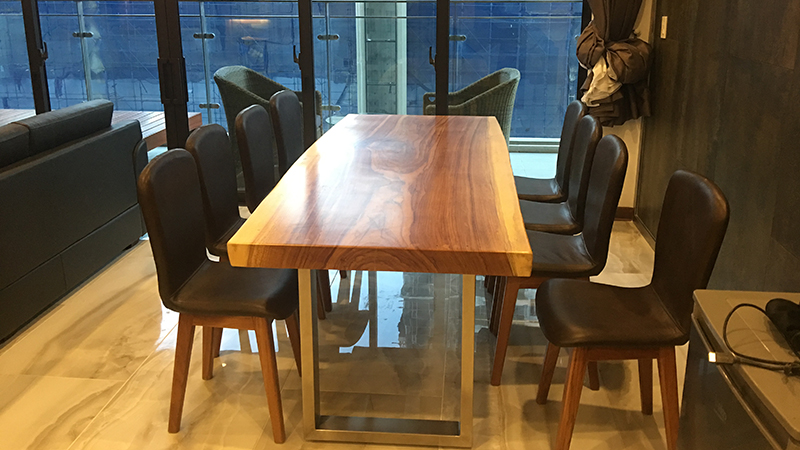 Bàn ăn làm từ gỗ nguyên khối kết hợp dát viền gỗ màu trắng, tăng thêm phần nổi bật của sản phẩm