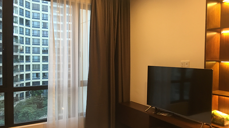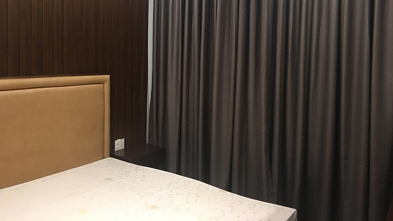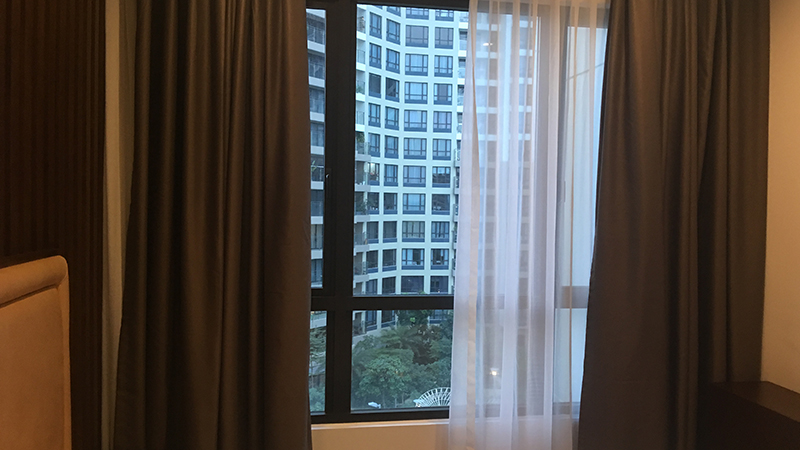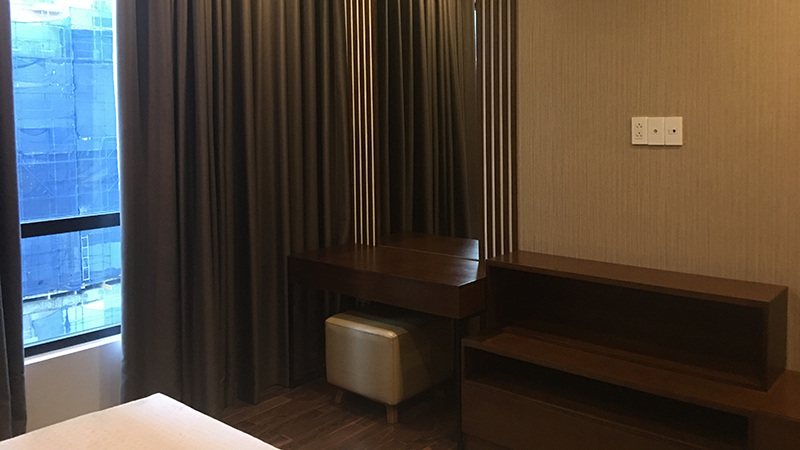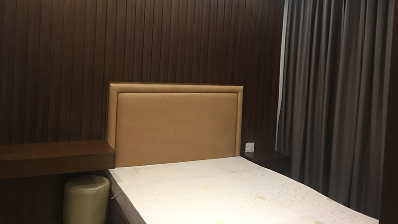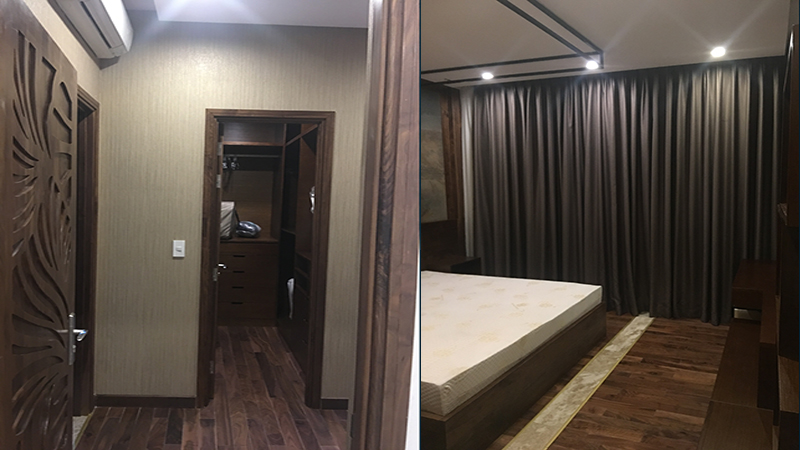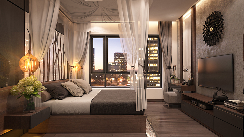 Giường ngủ được chế tác từ gỗ gõ đỏ, đặt song song với cửa sổ vừa có tác dụng đón ánh sáng và khí, vừa tạo góc nhìn đẳng cấp từ trên cao, đặc trưng chuẩn sống thượng lưu của những căn hộ xa hoa.
