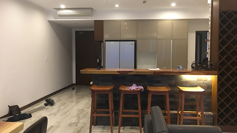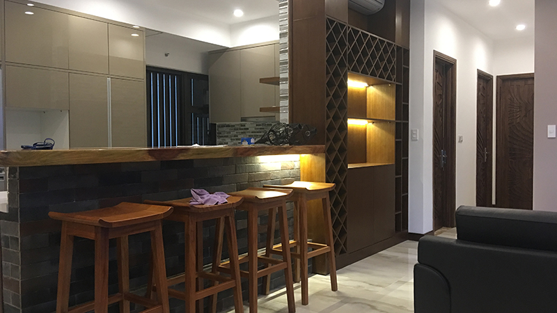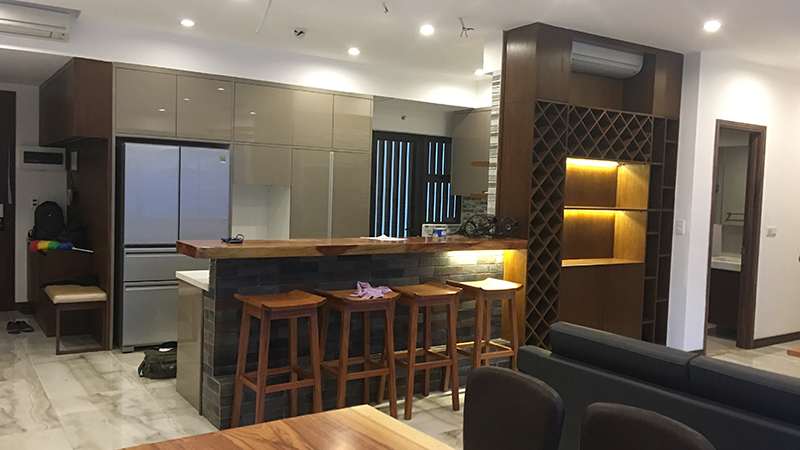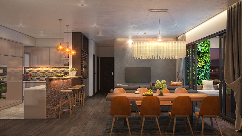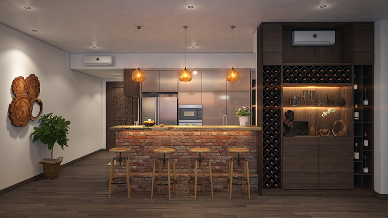 Sự tinh tế của lối thiết kế không gian mở, là phòng khách liền kề phòng bếp, được ngăn cách bởi quầy bar và tủ rượu độc đáo, là nơi vừa có thể ngồi thư giãn với nhau sau một ngày làm việc mệt mỏi, vừa có thể tận dụng như một chiếc bàn ăn mini... đầy tiện ích, đa năng.