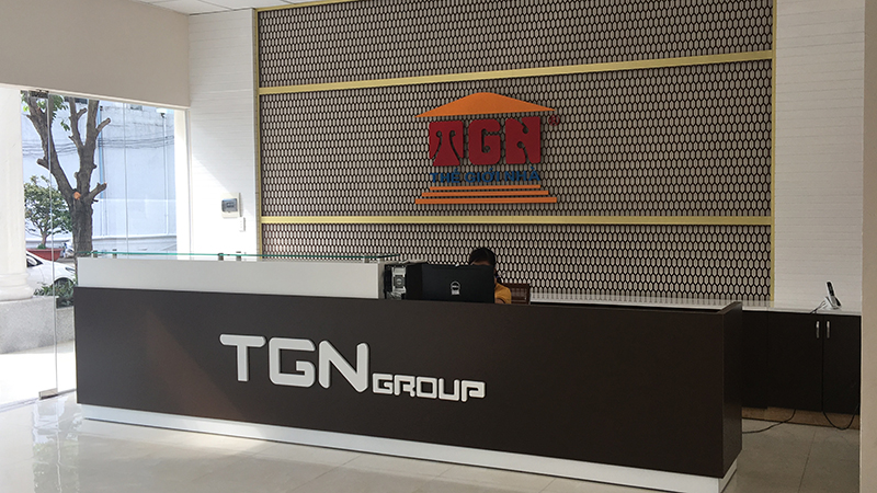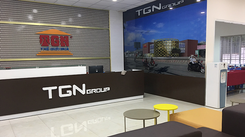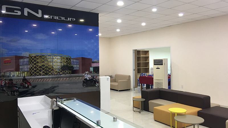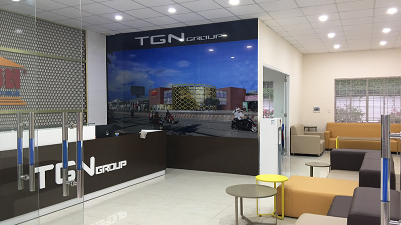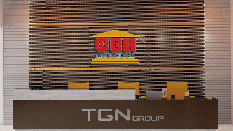 Sảnh chờ tiếp khách cùng banner hình ảnh trụ sở Thế Giới Nhà bắt mắt tăng tính nhận diện thương hiệu