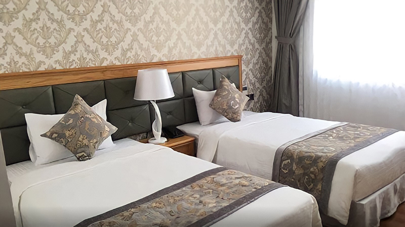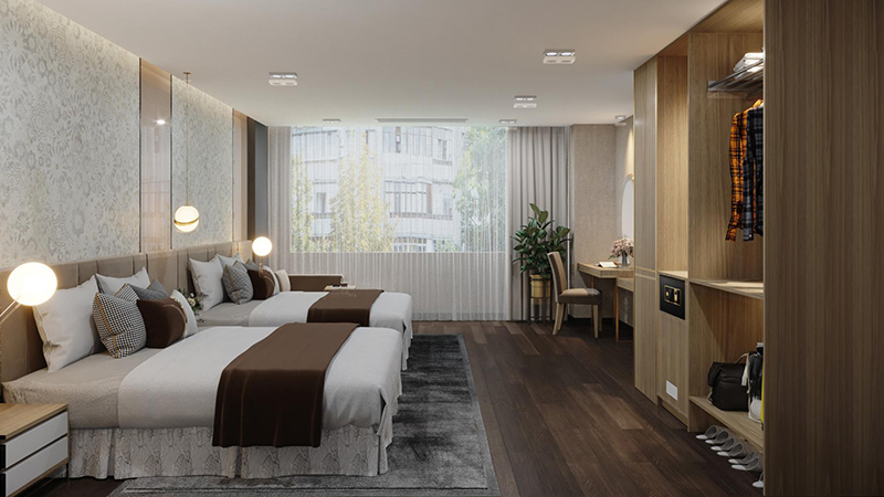 Gam màu nâu của nội thất phòng deluxe 2 giường đơn mang đến cảm giác ấm áp