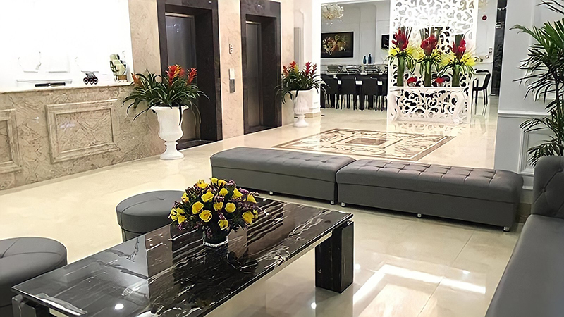 Không gian sảnh lễ tân ở chính giữa trung tâm, có nhiều ghế sofa ở sảnh, cho khách chờ check in, hoặc trả phòng, với thiết kế những dãy sofa xung quanh bàn trà, tạo thêm nhiều chỗ ngồi, thuận tiện cho việc, phục vụ đồng thời nhiều khách hàng.